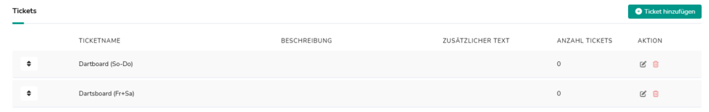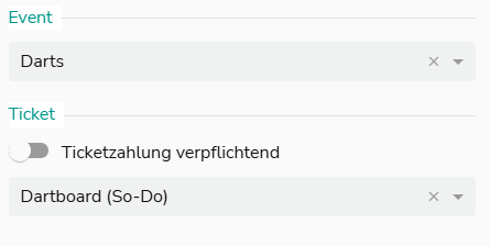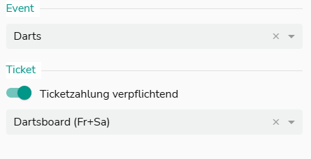 Wähle das Event ‚Darts‘ – Wenn du verschiedene Preise an verschiedenen Wochentagen anbietest, hinterlege das Ticket mit den richtigen Preisen in der passenden Vorlage.