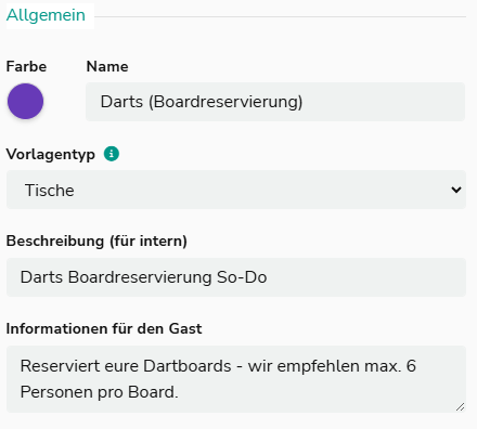 Wähle den Vorlagentyp Tische – bei verschiedenen Preisstufen vergib unbedingt eine interne Beschreibung, damit du später die richtige Vorlage zur den richtigen Tagen hinterlegst.