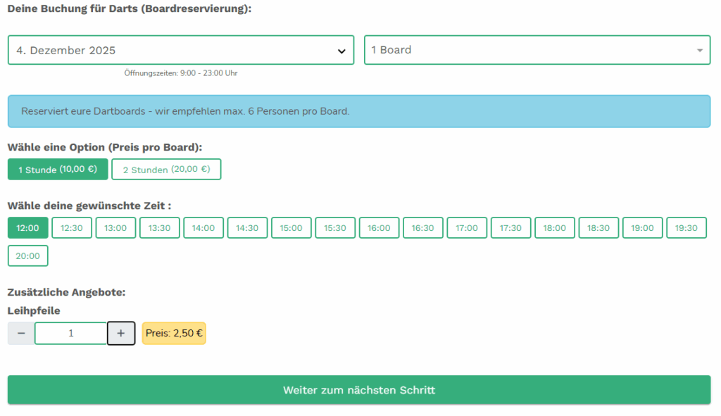 Buchungsmaske Darts (optionale Zahlung) im Testsystem – hier klicken!
