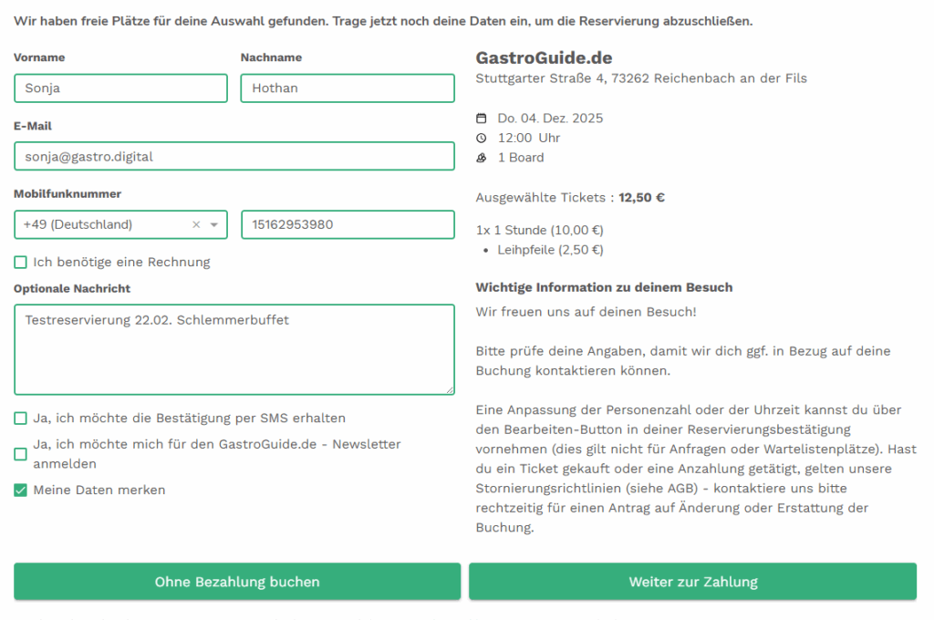 Im nächsten Schritt hat der Gast die Wahl nur zu reservieren oder direkt online zu zahlen: